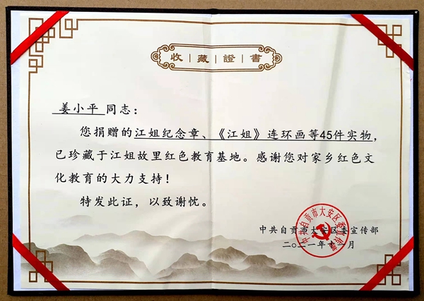 在“紅巖英烈”江姐犧牲72周年紀(jì)念日前夕,姜小平向自貢市江姐故里紅色教育基地?zé)o償捐贈了45件與江姐相關(guān)的文獻(xiàn)史料,讓藏品發(fā)揮應(yīng)有價值,讓紅巖精神代代相傳。