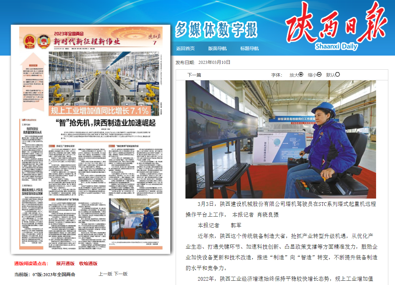 陜西日?qǐng)?bào) 2023年3月10日 7版把塔機(jī)操控室“請(qǐng)”到地面(本報(bào)記者 郭軍)2月28日,在西安市高陵區(qū)陜煤集團(tuán)所屬陜西建設(shè)機(jī)械股份有限公司(以下簡(jiǎn)稱陜建機(jī)股份)工業(yè)園塔機(jī)發(fā)運(yùn)廣場(chǎng),身高50米的塔機(jī)伸出長(zhǎng)長(zhǎng)的動(dòng)臂,來(lái)來(lái)回回吊運(yùn)材料?!按汗?jié)后,我們公司早早開(kāi)工,塔機(jī)發(fā)運(yùn)也變得更加忙碌?!彼C(jī)駕駛員周先春說(shuō)。與普通工地不同的是,塔機(jī)駕駛員沒(méi)有坐在駕駛室,而是坐在房間里對(duì)塔機(jī)進(jìn)行遙控操作。“以前在塔機(jī)上一待就是半天,連水都不敢喝,就怕上廁所。而且坐在幾十米高空,尤其對(duì)我們這些女塔機(jī)駕駛員來(lái)說(shuō),心理壓力特別大?!敝芟?..