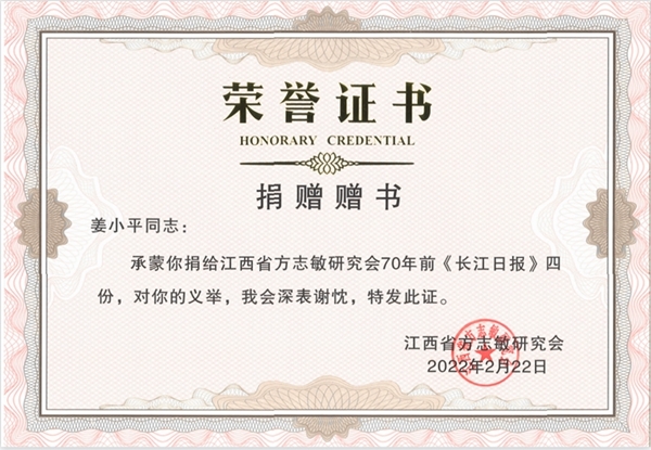2月22日,陜建機(jī)股份公司職工姜小平收到了江西省方志敏研究會(huì)頒發(fā)的捐贈(zèng)證書,感謝他慷慨捐贈(zèng)4份70多年前《長江日?qǐng)?bào)》的原版報(bào)紙,這些珍貴的史料再現(xiàn)了“方志敏同志戰(zhàn)斗的一生”?!皵橙酥荒芸诚挛业念^顱,決不能動(dòng)搖我的意志!”“朋友,我相信,到那時(shí),到處都是活躍的創(chuàng)造,到處都是日新月異的進(jìn)步……”1935年,方志敏同志被捕后面對(duì)國民黨反動(dòng)派威逼利誘,在獄中寫下鏗鏘誓言以及對(duì)未來美好中國的期盼。今天讀來,我們?nèi)匀粸橹畡?dòng)容,深刻感受到老一輩共產(chǎn)黨人為了革命理想不懼任何犧牲的豪邁情懷。2022年1月21日,21歲的方瀚輝(方志敏曾孫...